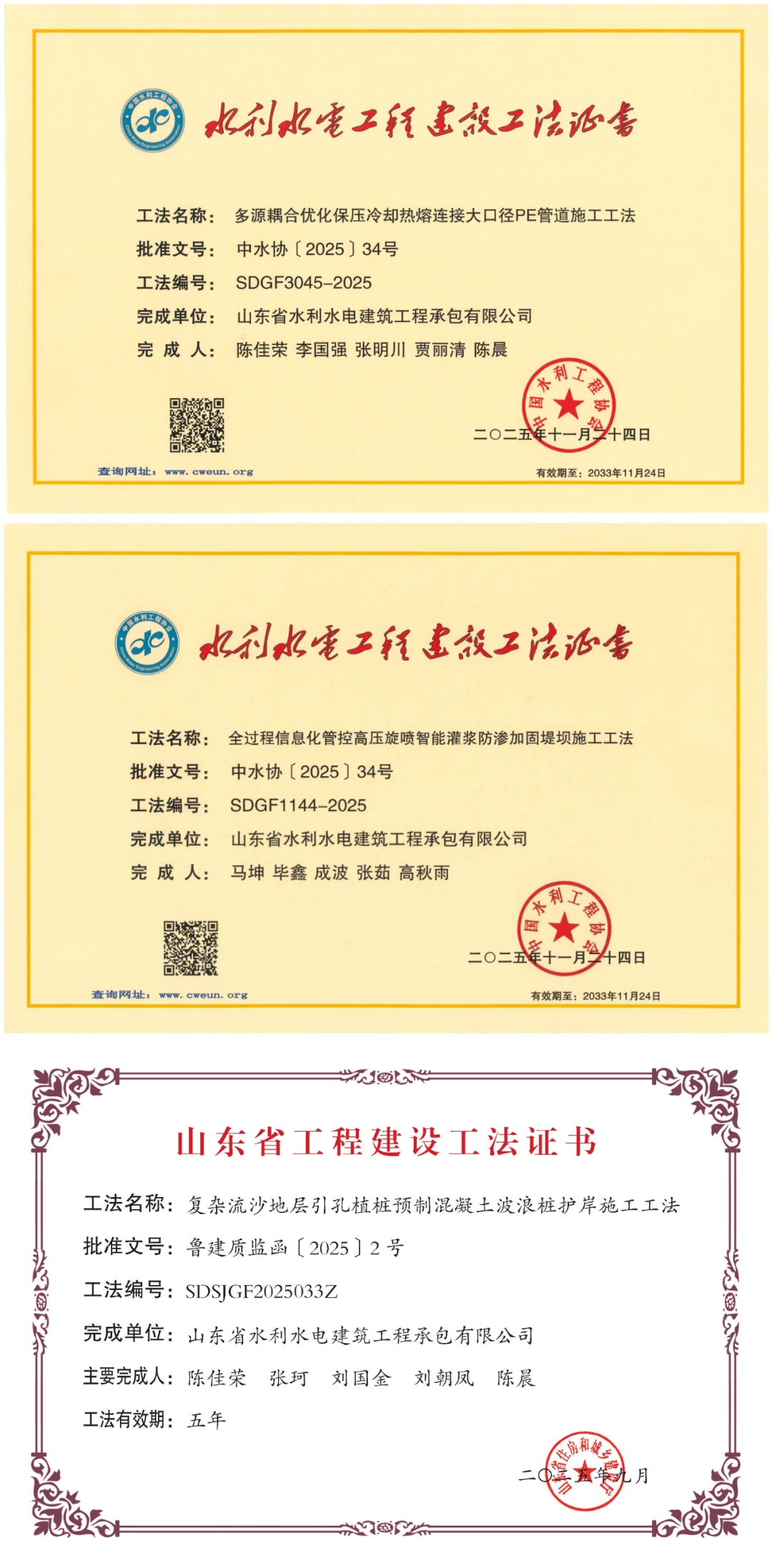 近日,公司水利施工技术领域再传捷报。“多源耦合优化保压冷却热熔连接大口径PE管道施工工法”与“全过程信息化管控高压旋喷智能灌浆防渗加固堤坝施工工法”被中国水利工程协会认定为“2025年度水利行业工法”,同时,“复杂流沙地层引孔植桩预制混凝土波浪桩护岸施工工法”被山东省住房和城乡建设厅认定为“2025年度省级工法”。