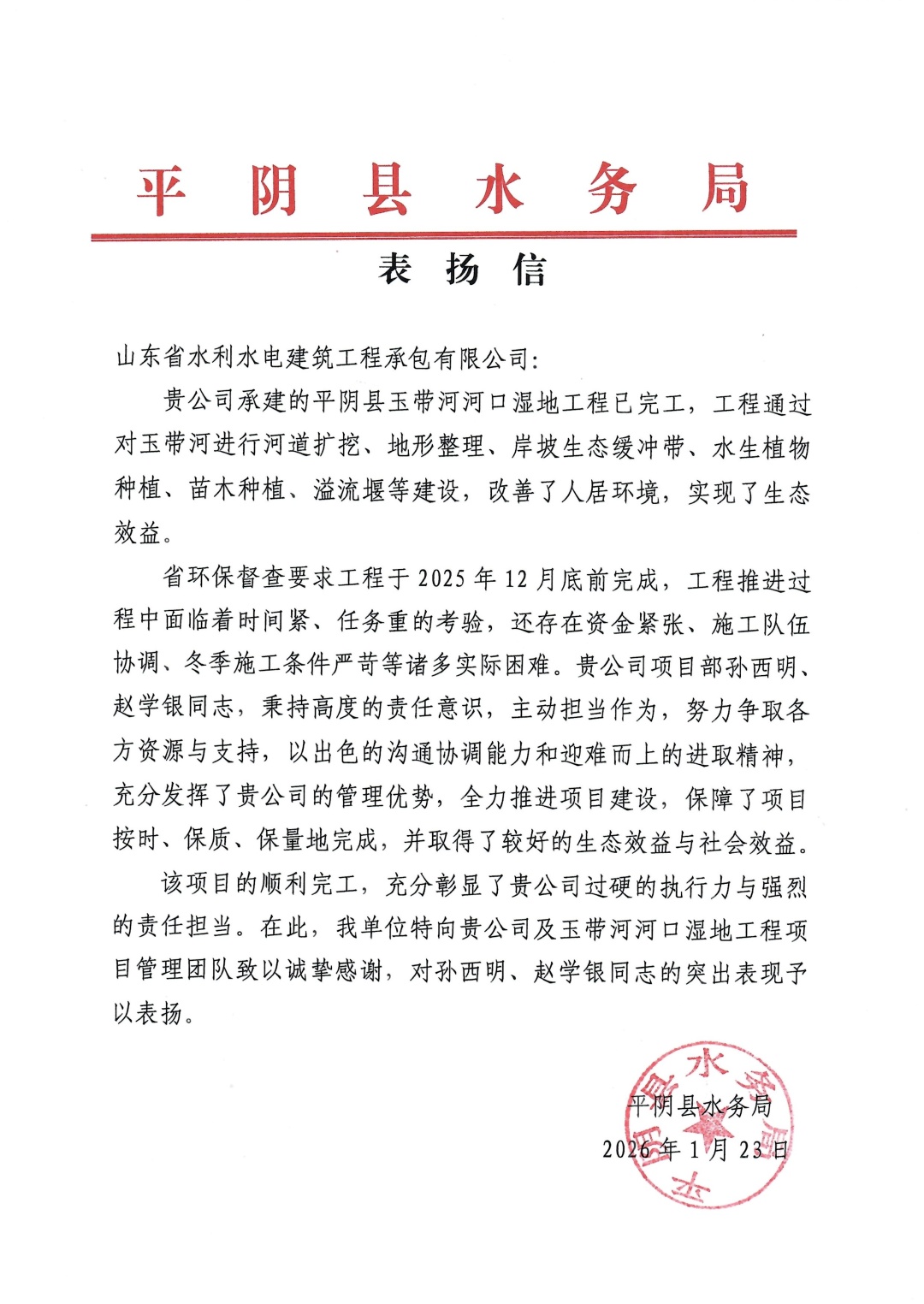 近日,山东省水利水电建筑工程承包有限公司收到平阴县水务局发来的表扬信,信中对公司圆满完成平阴县玉带河河口湿地工程建设任务,以及项目管理团队展现出的专业能力与责任担当给予了高度肯定。